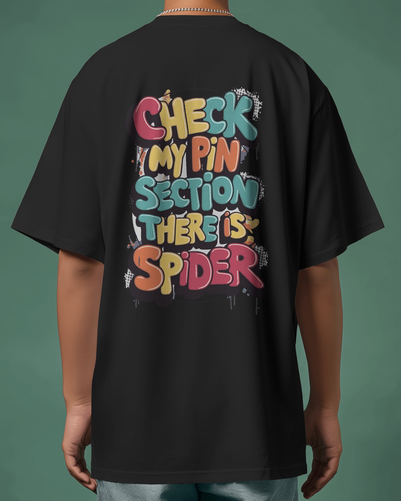 ₹499.00Black oversized t-shirt featuring vibrant multicolored graffiti-style text design on the back