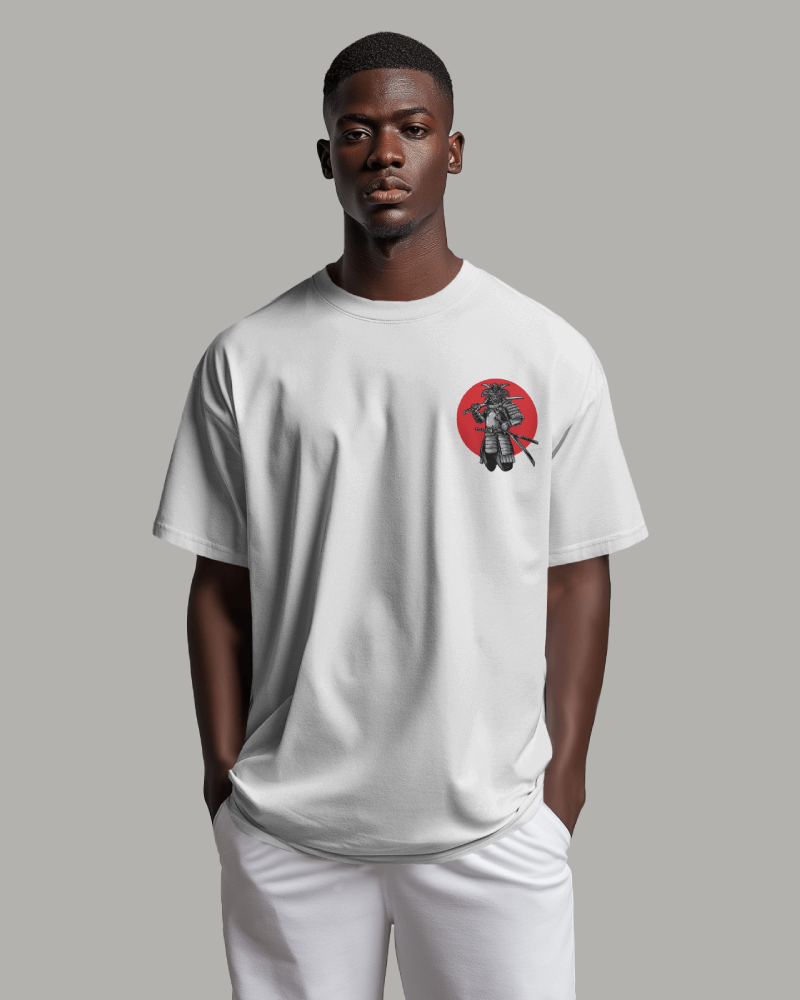 ₹499.00White t-shirt featuring a striking back print of a samurai warrior against a red sun circle