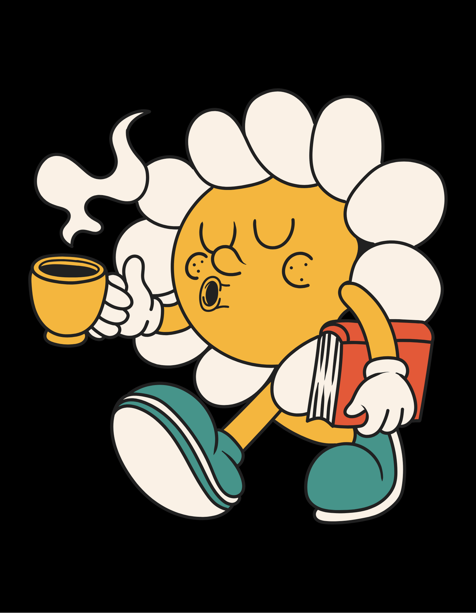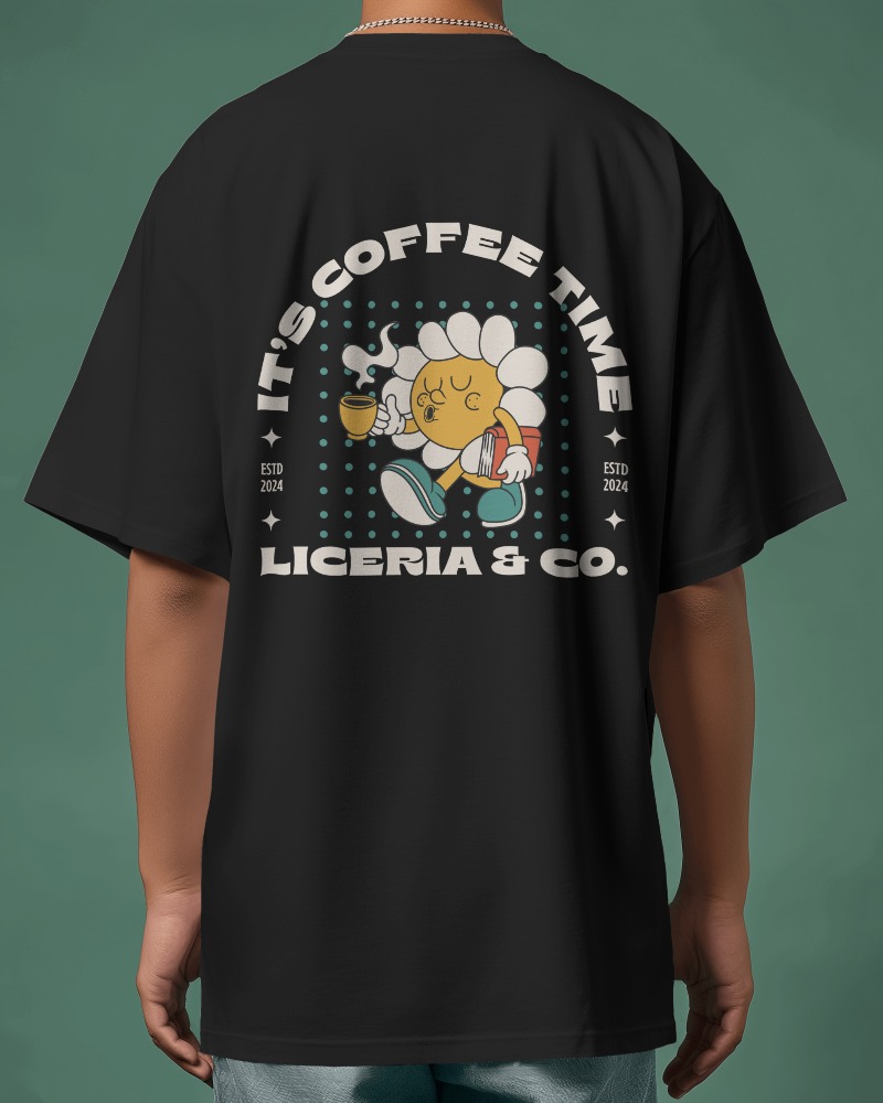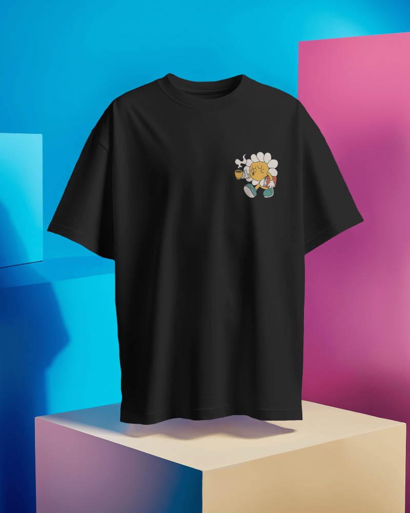 Celebrate your love for coffee with this charming oversized t-shirt featuring an adorable coffee-drinking character. Crafted from soft, comfortable fabric for a relaxed fit. The playful graphic adds a touch of whimsy to your casual wardrobe. Pairs perfectly with your favorite jeans or shorts for laid-back style.