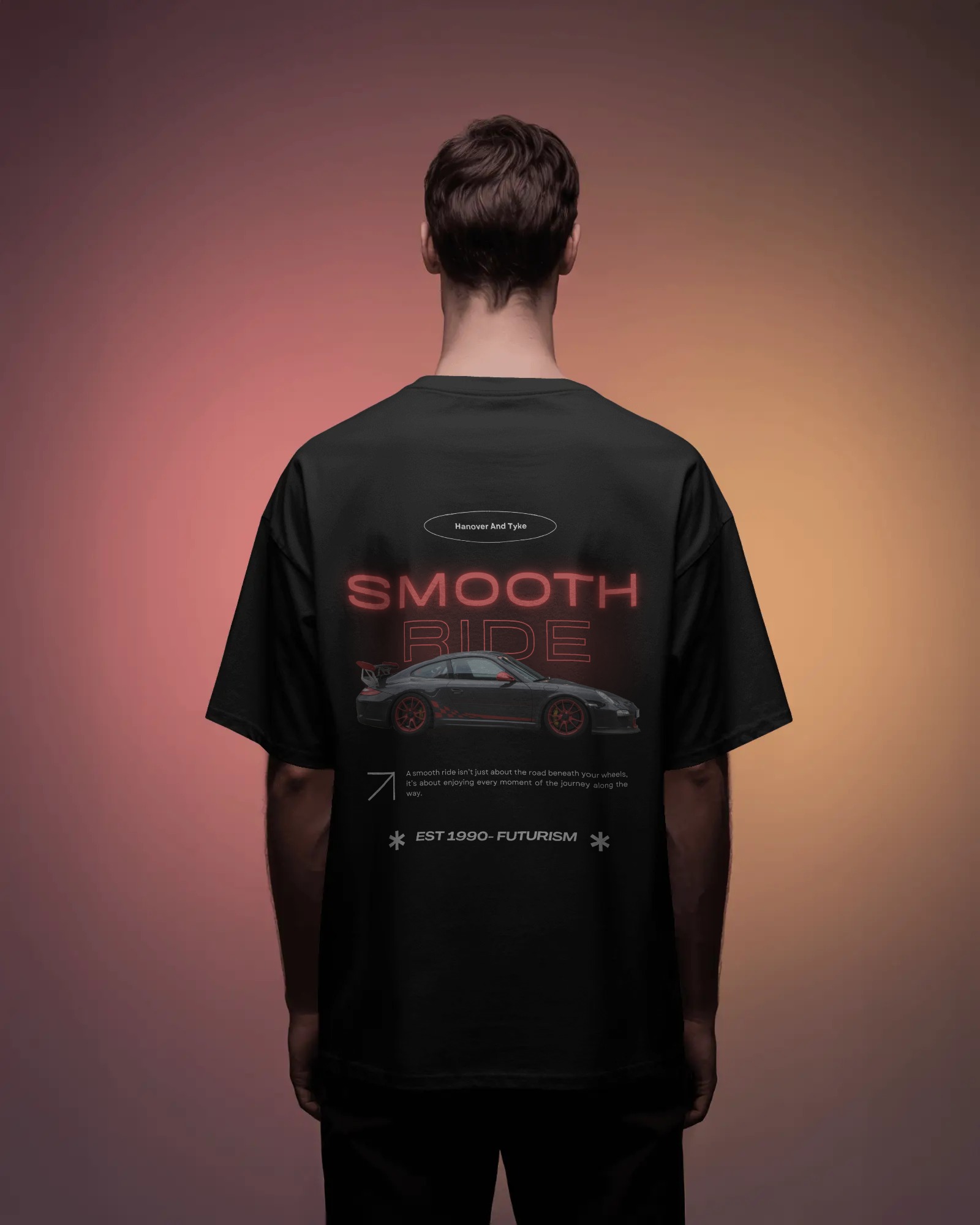 This oversized T-shirt features a sleek “Smooth Ride” sports car graphic inspired by modern automotive culture. The back design showcases a detailed performance car illustration highlighted with bold neon-style typography that reads SMOOTH RIDE, giving the design a futuristic and high-speed aesthetic. Subtle graphic elements and minimal text add depth to the layout, making it perfect for car enthusiasts and streetwear lovers who appreciate stylish automotive-inspired designs.