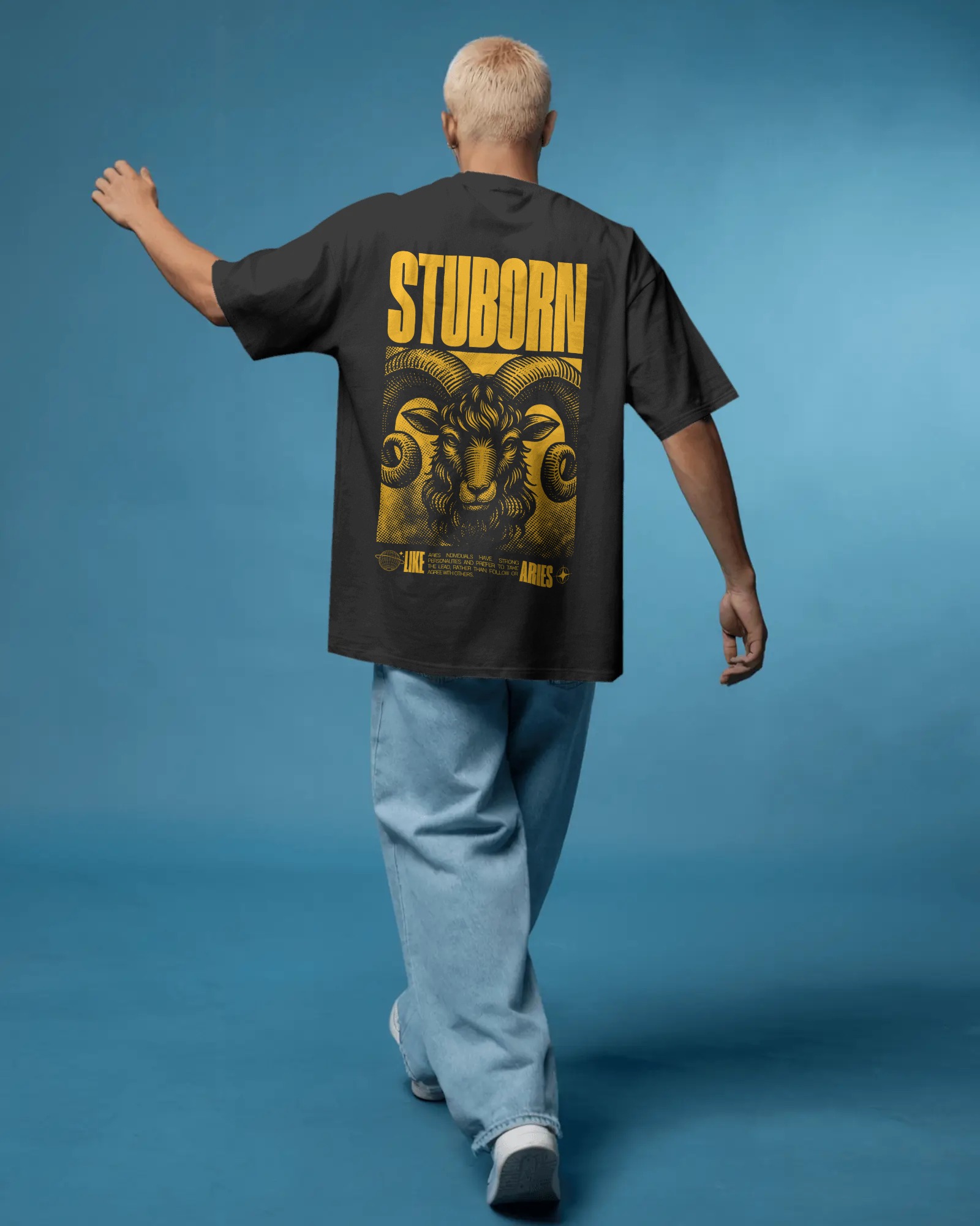 This oversized T-shirt features a bold zodiac-inspired design representing Aries, symbolized by a powerful ram illustration. The artwork showcases a detailed ram head graphic in a striking golden tone, placed beneath the bold typography “STUBORN”, highlighting the strong and determined personality often associated with the Aries zodiac sign. The textured vintage-style graphic combined with the dark base creates a bold streetwear look that blends astrology with modern fashion.