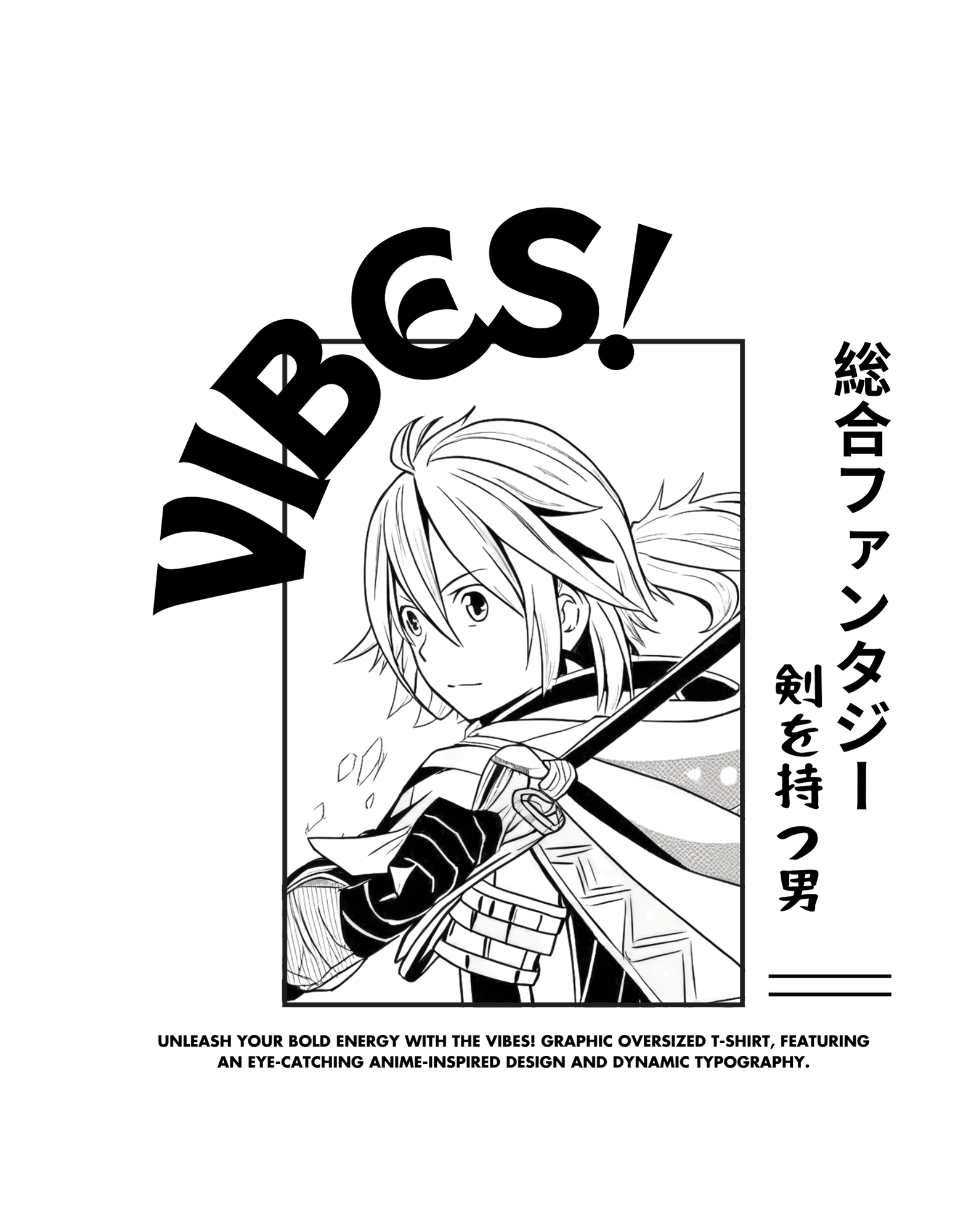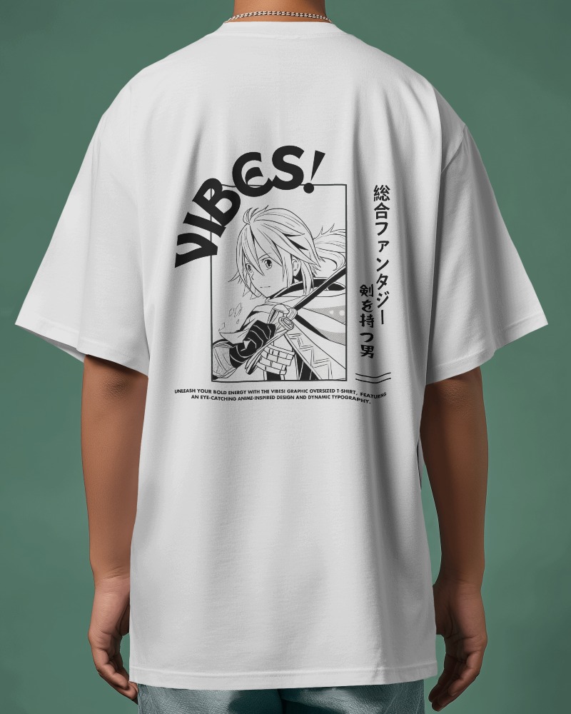Unleash your bold energy with the VIBES! Graphic Oversized T-Shirt, featuring an eye-catching anime-inspired design and dynamic typography.