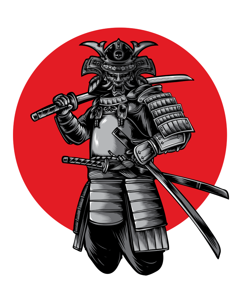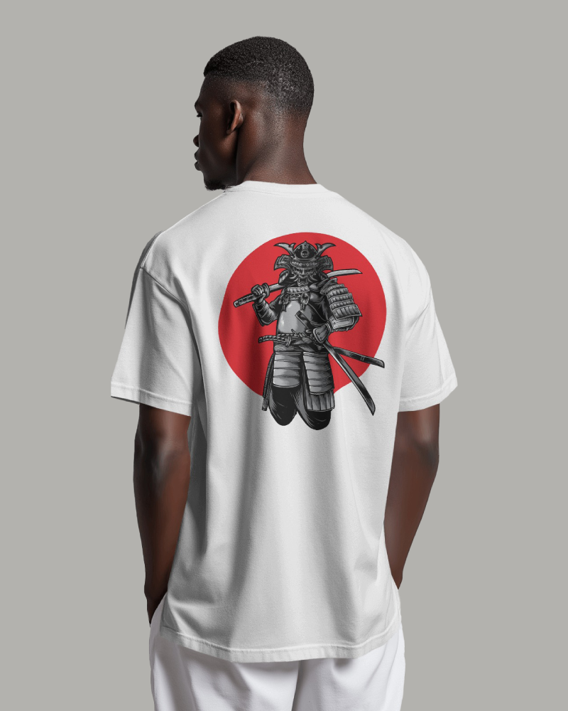 White t-shirt featuring a striking back print of a samurai warrior against a red sun circle