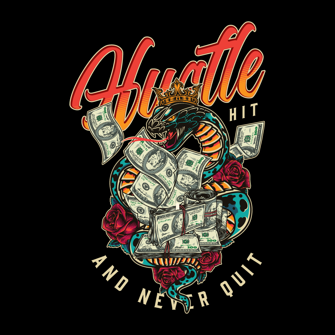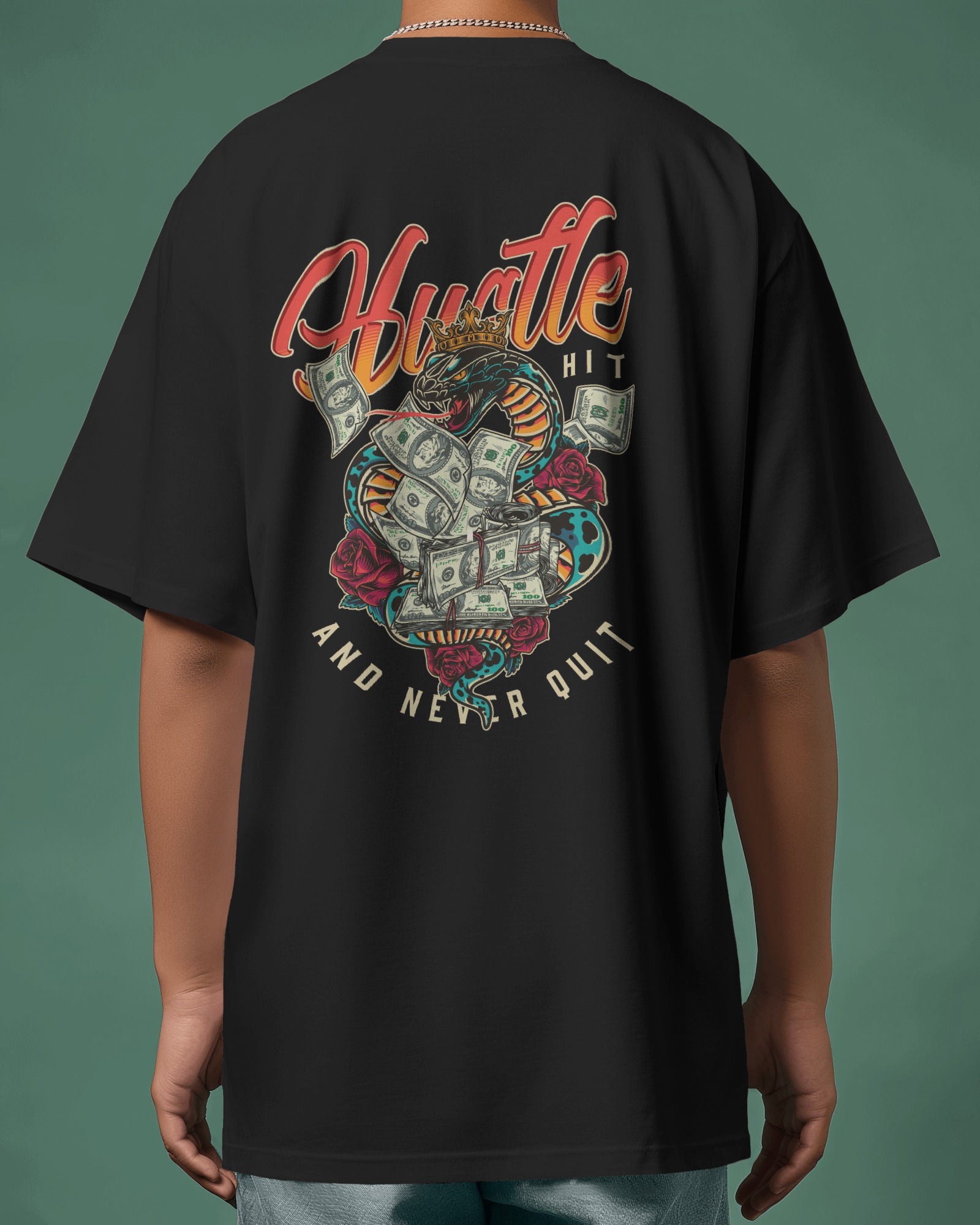 Black oversized t-shirt with a striking snake and money design featuring ‘Hustle’ text and red roses