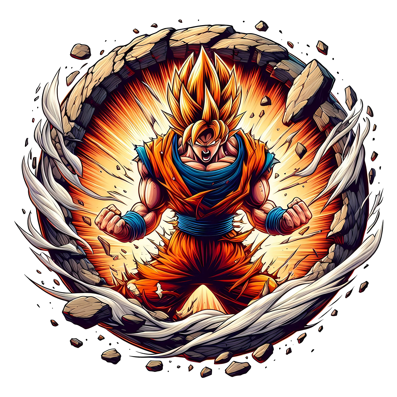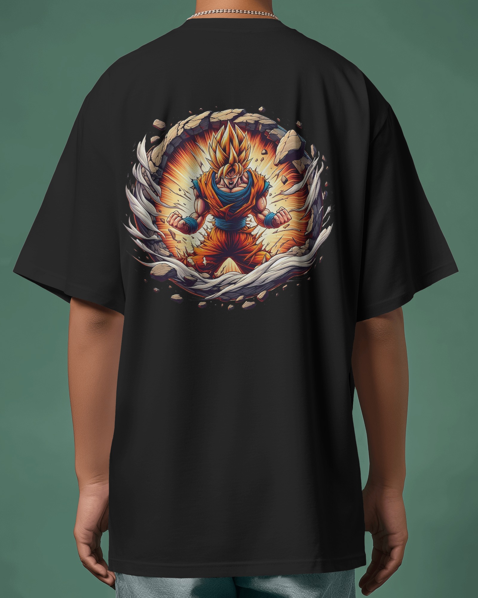 lack oversized t-shirt featuring Dragon Ball Z’s Goku in Super Saiyan form with explosive power effect