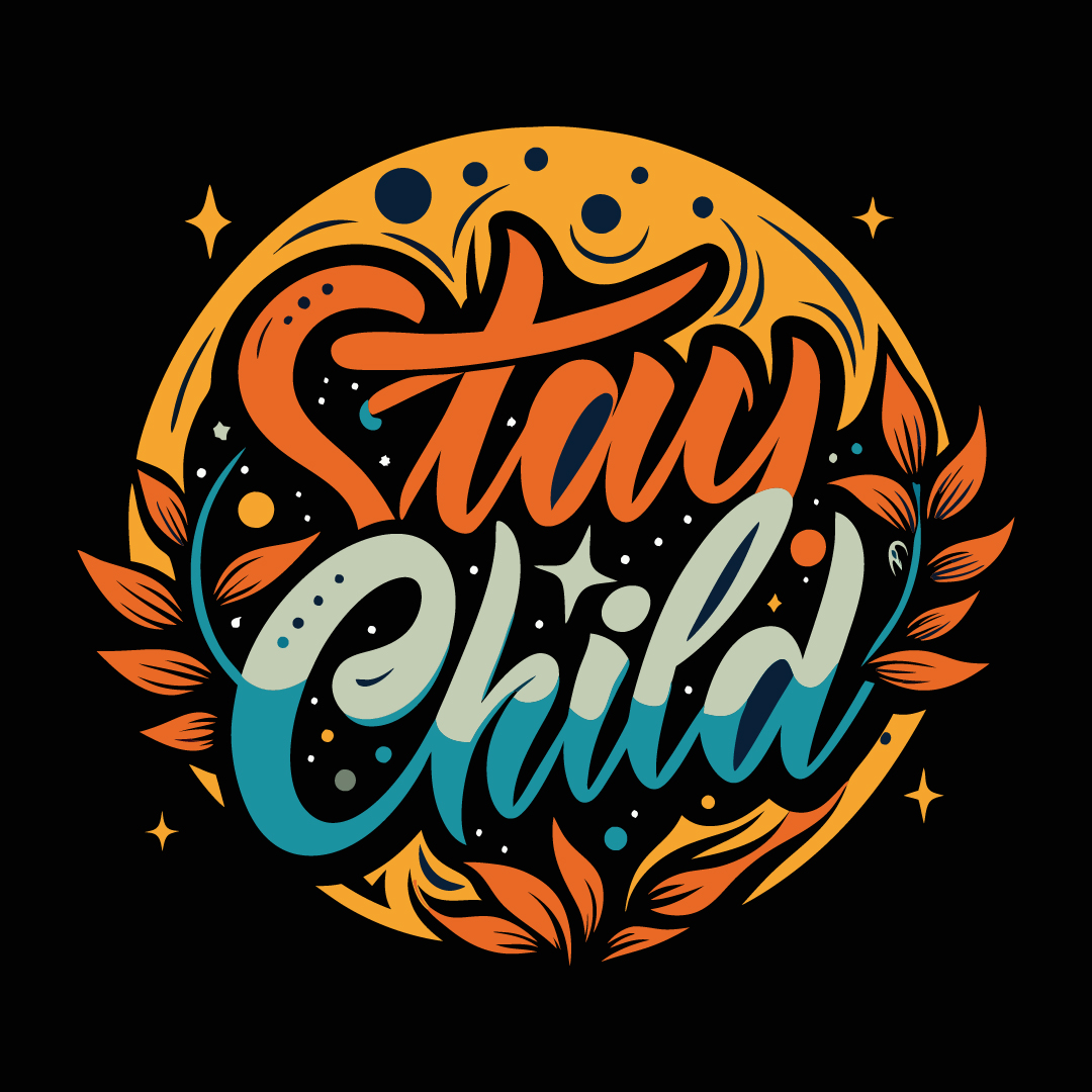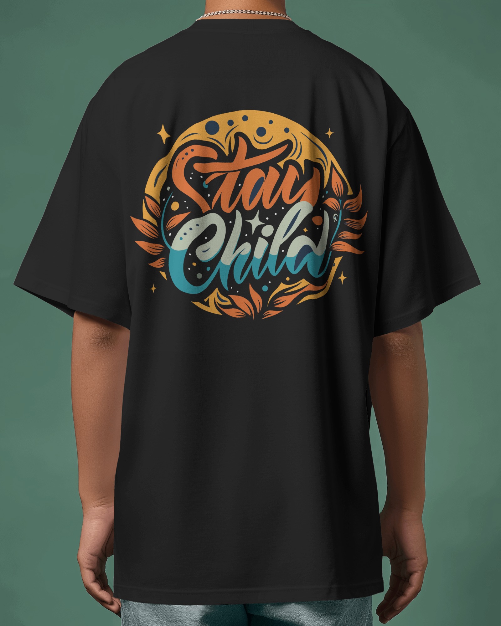 Black oversized t-shirt featuring a circular ‘Stay Child’ design