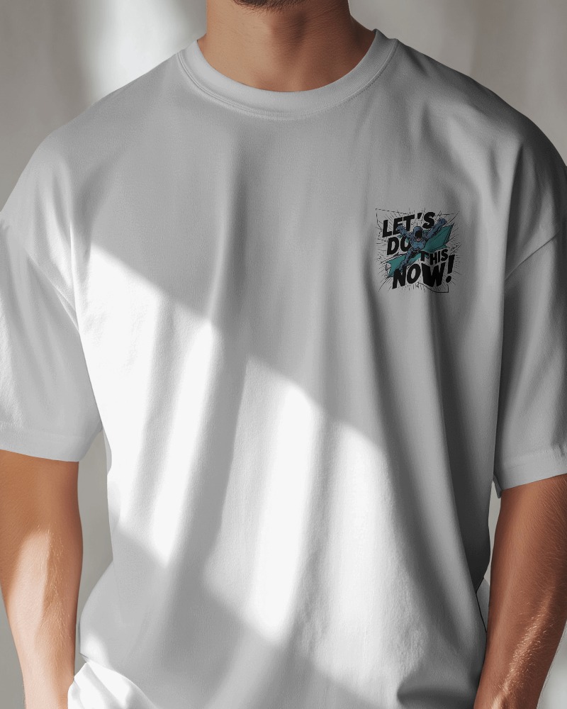 This oversized white t-shirt features a dynamic illustration of a superhero character with the motivational phrase “LET’S DO THIS NOW!”