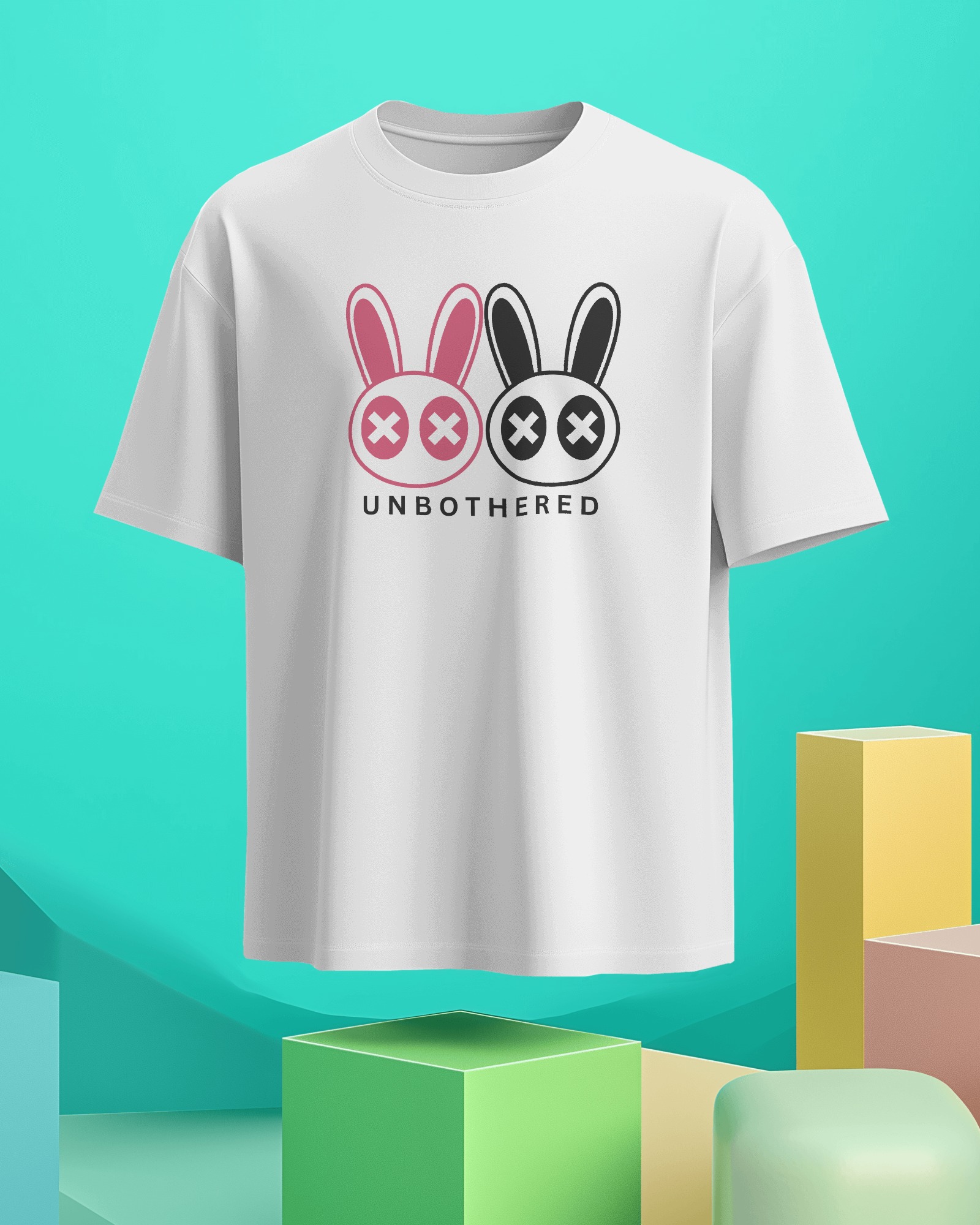 A bold and relaxed oversized t-shirt featuring an eye-catching “UNBOTHERED” bunny graphic!