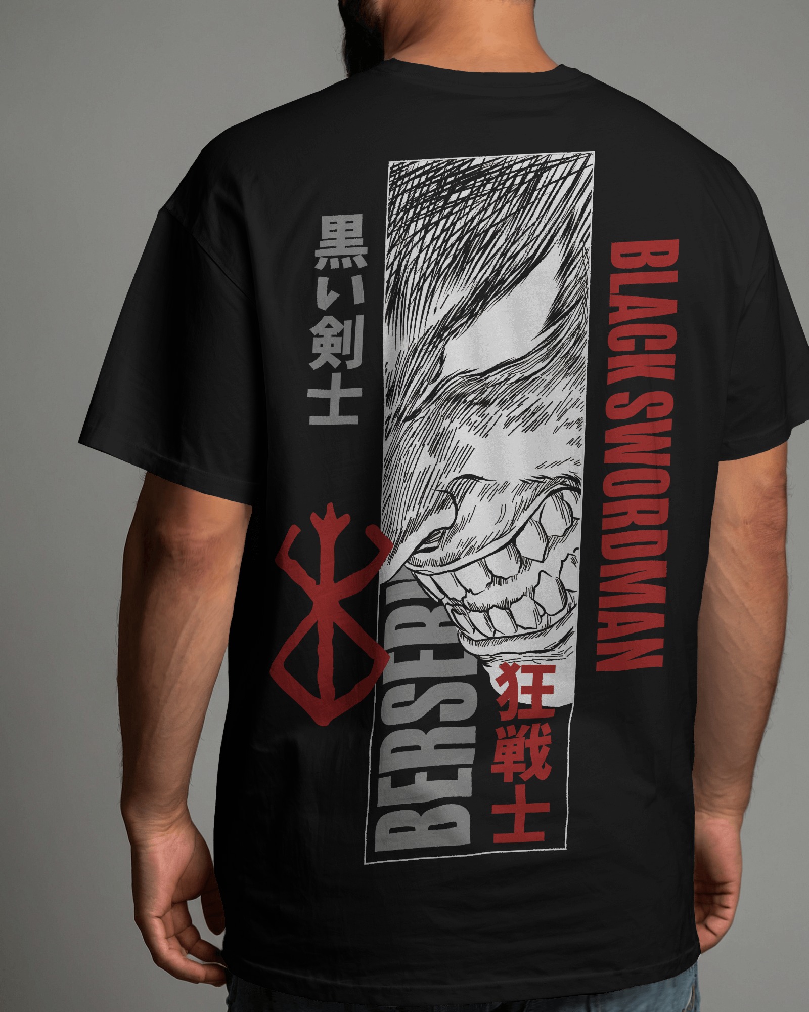 Oversized T-shirt with a Black Swordsman and Berserk-themed back print.
