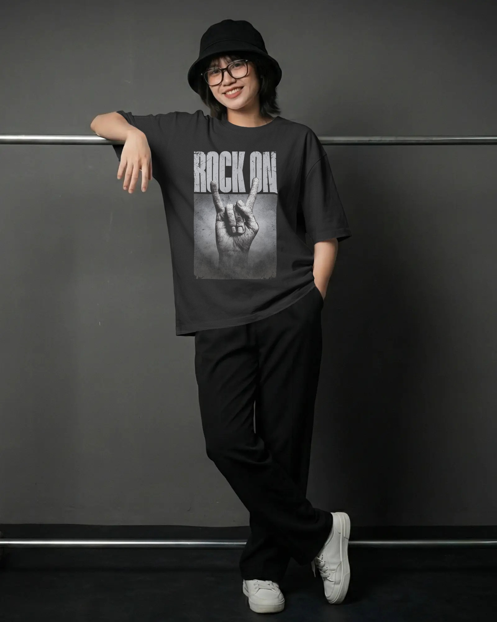 Oversized women’s T-shirt featuring a bold Rock On hand gesture graphic inspired by rock music culture.